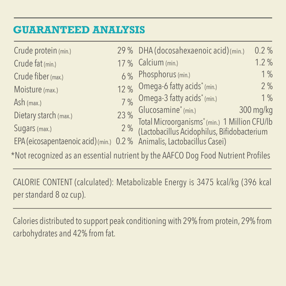 'Rainbow trout, catfish, catfish meal, whole red lentils, whole pinto beans, whole green peas, catfish oil, whole green lentils, whole chickpeas, whole yellow peas, whole perch, whitefish meal, fish oil, mackerel meal, lentil fiber, Natural fish flavor, pea starch, salt, dried kelp, whole pumpkin, collard greens, whole apples, whole pears, mixed tocopherols (preservative), zinc proteinate, vitamin E supplement, calcium pantothenate, riboflavin, folic acid, freeze_x0002_dried cod liver, copper proteinate, dried chicory root, turmeric, sarsaparilla, althea root, rose hips, juniper berries, citric acid (preservative), rosemary extract, dried Lactobacillus acidophilus fermentation product, dried Bifidobacterium animalis fermentation product, dried Lactobacillus casei fermentation product.'