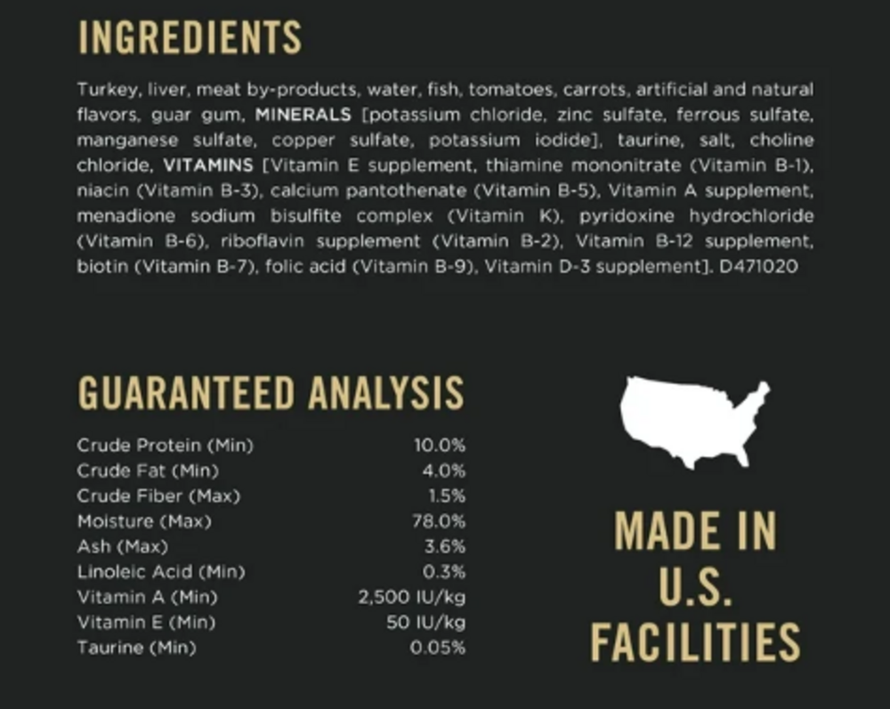 Water sufficient for processing, liver, turkey, wheat gluten, tomatoes, carrots, meat by products, spinach, chicken, corn starch modified, artificial and natural flavors, soy flour, salt, calcium phosphate, potassium chloride, taurine, added color, choline chloride, Vitamin E supplement, thiamine mononitrate, zinc sulfate, ferrous sulfate, niacin, calcium pantothenate, Vitamin A supplement, menadione sodium bisulfite complex (source of Vitamin K activity), copper sulfate, manganese sulfate, pyridoxine hydrochloride, riboflavin supplement, Vitamin B 12 supplement, biotin, folic acid, Vitamin D 3 supplement, and potassium iodide